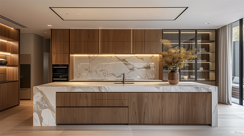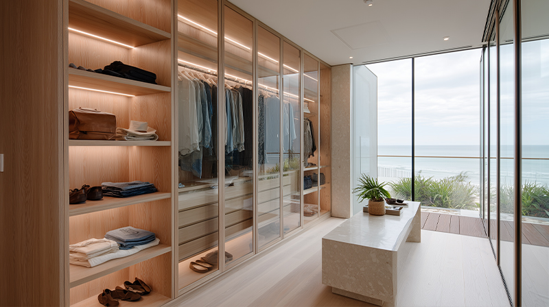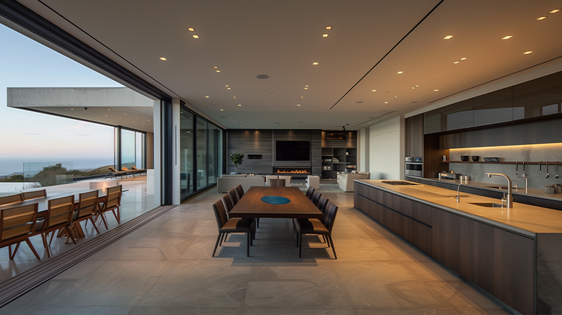 Contemporary coastal interior featuring natural materials and stone surfaces.